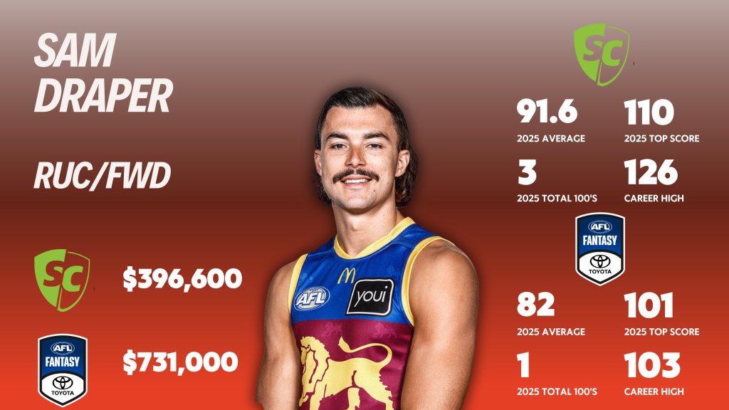 Sam Draper is now a key figure in the Brisbane Lions’ 2026 lineup, and importantly for us, he’s got ruck/forward eligibility that adds significant value for fantasy coaches. That dual position status creates flexibility that few players at his price point can offer.