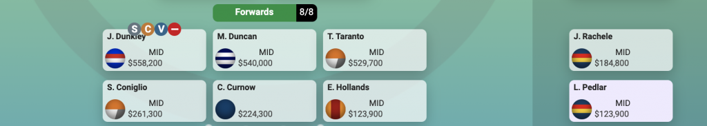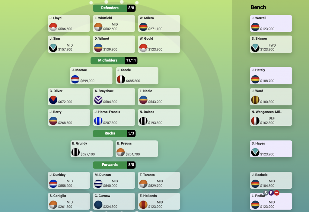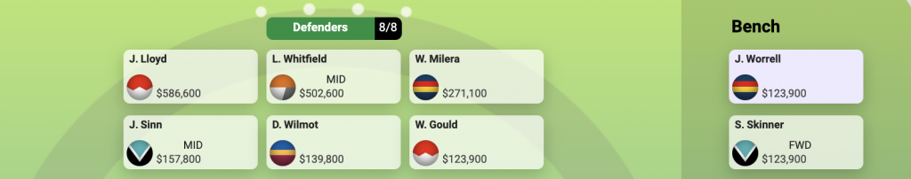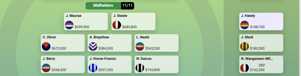 A bit of a premium rookie pick – I’ve selected Finn Maginness at M7 in part due to his price tag allowing me to pivot to any in form rookie priced player during the preseason games. There has however been a bit of a wrap on how he’s approached his preseason and a couple years in the system has always been a pretty good sign for a better immediate fantasy output. And if COVID is anything like chicken pox, he’s already had it anyway (only joking).