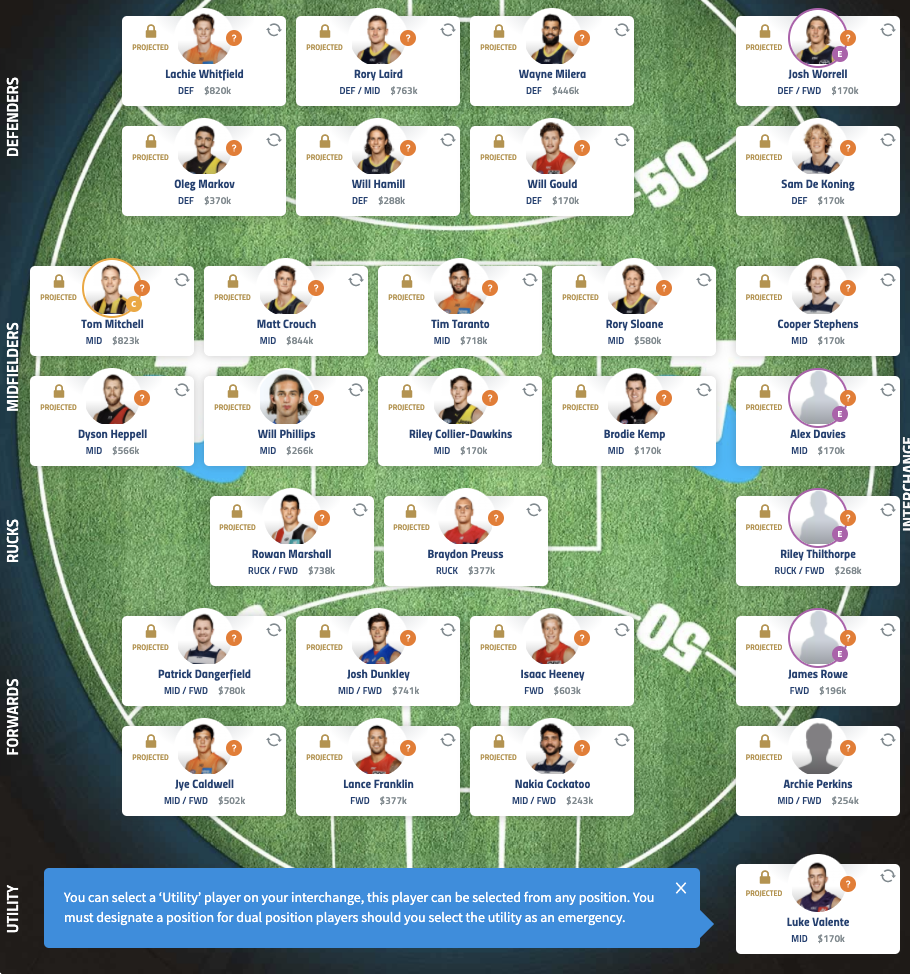 Again went with the def thought process in the fwds. In the role I saw Dunkley play last week he will be in the top few fwds for the year and starts. The other guys – Phillips, DeGoey and Cameron represent value. Warner and a rook the most likely f5/f6 at this stage depending on teams.
