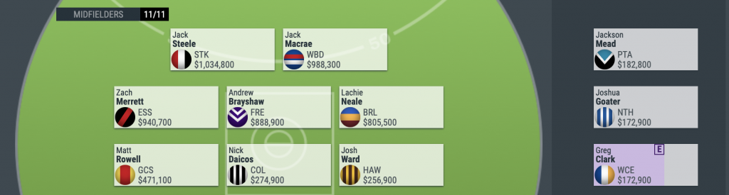 With your starting midfield premiums, you need a minimum of two captaincy options for any given matchup. With Jack Steele and Jackson Macrae, I’ve ticked that box. Both are dynamic scoring options and have been among the best games to hundreds conversation rate over the past few seasons. Zach Merrett keeps getting it done. Year on year, he’s shown he’s a 110 performing midfielder. Barring a preseason scoring explosion, he might slide a little under the radar. But in reality, Zach is one of the safest picks. I know Andrew Brayshaw ‘broke out’ to the premium territory last year, but I think he gets into the elite scoring category this year. I believe he’ll match it with the Merrett/Laird/Mills types and be a 110 averaging performer. Lachie Neale is valuable, I don’t think he rebounds back to his ‘BCV’ scores of 2020, but he’s a safe 100-105 guy based on his history. At worst, he’ll drift into becoming a reliable M8 by the close of the season. At the same time, Matt Rowell could be anything. Here are the three scenarios, and all can work. Best Case – It becomes a premo and a season-long hold. Middle Ground – I hold for a period of games can make a quick upgrade via him. Worst Case – His scoring fails, but I move him to the stepping stone that is firing. The reality is there’s not a bad scenario. I’ll start with five rookies in the midfield with this structure. It’ll come as no surprise that Nick Daicos and Josh Ward feature. Both are developing teams that’ll give opportunity, plus they have a scorinåg pedigree as a junior. All of Mead/Goater/Clark is just the placeholders but should push for games in 2022.