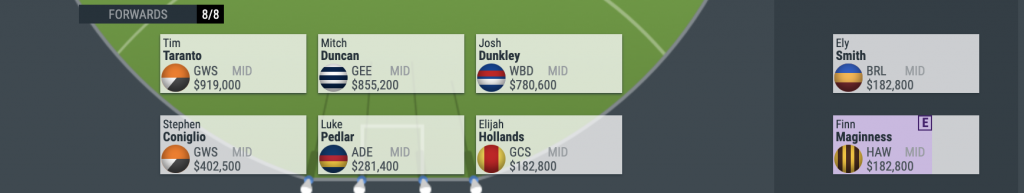 Before Leon Cameron started playing around with player positions, Tim Taranto averaged 110 last season. Plain and simple, if he gets back to his heavy midfield role, he’d have been in the mix as a top tier midfielder. The fact he’s FWD eligible makes him near impossible to pass up. The same is true for Mitch Duncan. He’s one of the most reliable 95-105 scoring players every match. Yes, he’s got some increasing injury concerns, but those will be mitigated by having him in the starting squad and with what I expect to be a high ownership percentage. It feels like a luxury to have Josh Dunkley at F3. But, in reality, he could well be the top forward in the game. Pre-injury last season, he showed his scoring power. If you believe he’s got a safe role (which I do), then I can’t see a world where he won’t dominate the year. Stephen Coniglio would be on the radar as a MID only, but as a DPP MID/FWD, he’s skyrocketed up my relevance rankings. Historically he’s got the ability to be a 100+averaqging player, and with him being one of the most popular players to own, I can’t see any risk to starting with him. My final four is Luke Pedlar, who should see a significant uptick in games and midfield minutes for the developing Crows. Elijah Hollands should be the most owned player in the game. He’s a basement price and DPP cash cow that’ll play round one. Lock and load. Both Smith and Maginness are just placeholders until the cash cows become clean in Feb/March.